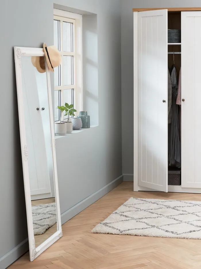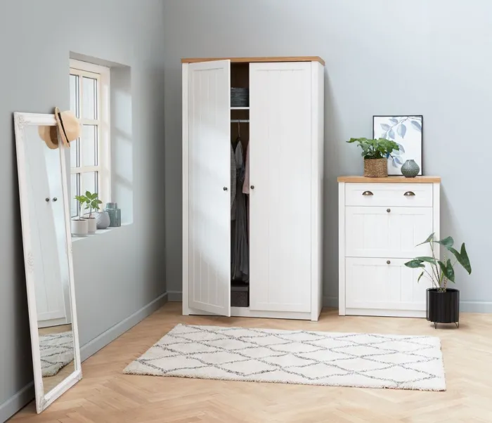 Kunstfiner og MDF. Skabets indretning: 1 hylde og 1 bøjlestang. B112 x H210 x D61 cm