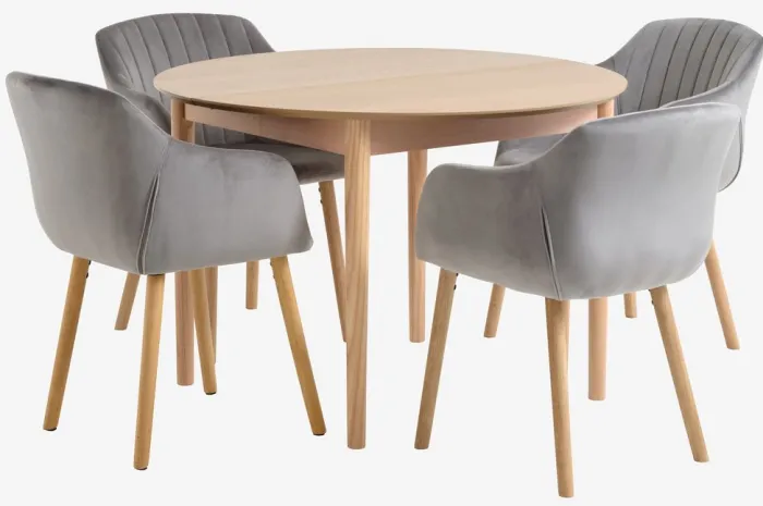 MARSTRAND + ADSLEV Spisebordssæt|MARSTRAND Ø110 bord eg + 4 ADSLEV stole grå velour
