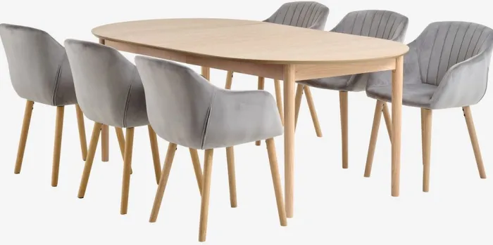 Be the first to review “MARSTRAND + ADSLEV Spisebordssæt|MARSTRAND Ø110 bord eg + 4 ADSLEV stole grå velour” Annuller svar