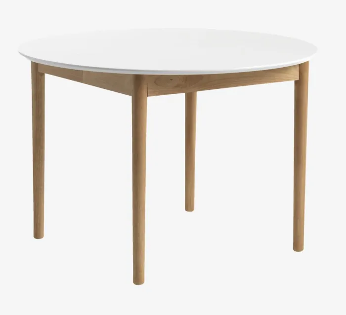 Spisebord med udtræk. Inklusiv 2 tillægsplader. Det runde spisebord har hvid bordplade i MDF og ben i massivt træ. Træet er lakeret for at forlænge holdbarheden. Du kan nemt forlænge bordet til 200 cm for at rumme større sammenkomster. Ø110 x H75 cm