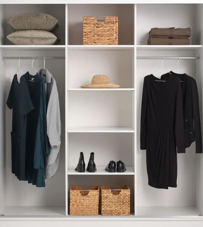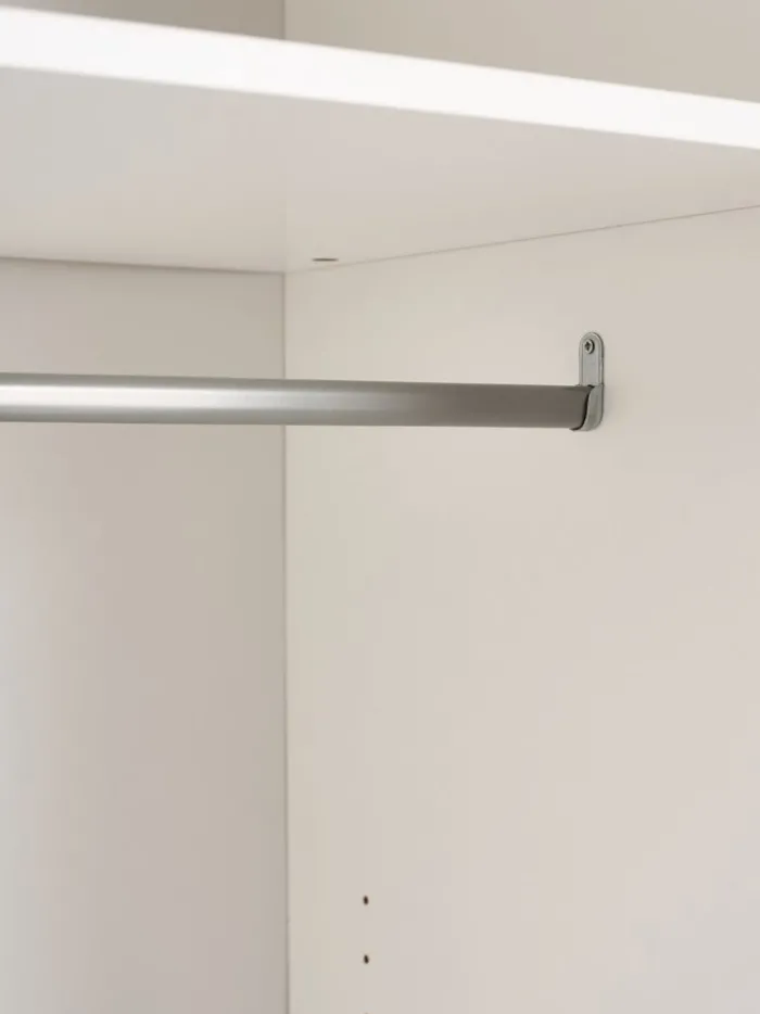 Kunstfiner. Skabets indretning: 6 hylder og 2 bøjlestænger. B179 x H201 x D62 cm