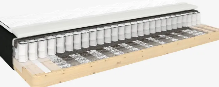 Dobbeltfjedret boxmadras 90×200 cm med 5 komfortzoner, som giver en præcis og optimal støtte. Øverst pocket-fjedre 250/m², polstret med purskum. Nederst minibonell-fjedre 150/m². Inkl. 5 cm tyk topmadras med kerne af trykaflastende memory foam, som former sig præcist efter kroppen. Vaskbart strækbetræk med blød, kraftig quiltning. Ekskl. ben.