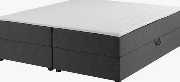 Kontinentalseng 180×200 cm. 2 springmadrasser med bonellfjedre 240/m², polstret med purskum. 1 topmadras, 3 cm tyk med kerne af purskum. Vaskbart betræk. Basen består af 2 polstrede rammer. Med opbevaringsplads. Inkl. ben. Ekskl. gavl.