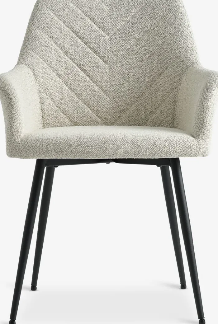 Spisebordsstol med armlæn, der giver ekstra støtte og komfort. Stolen har et polstret sæde og ryglæn i råhvidt stof. Sorte ben i stål.