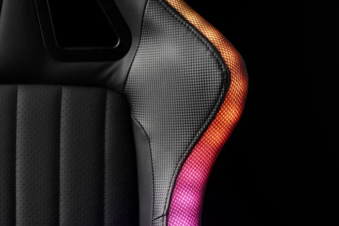 Kunstlæder og mesh. Stolen er udstyret med fjernbetjent LED-lys, som har adskillelige farveindstillinger. Puder til ekstra støtte i lænd og nakke. Med indstillelige armlæn og justerbar højde. B70 x H126-136 x D70 cm