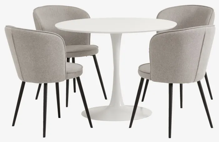 RINGSTED + RISSKOV Spisebordssæt|RINGSTED Ø100 bord hvid + 4 RISSKOV stole lysegrå
