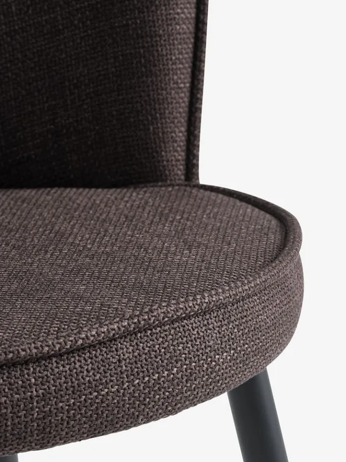 Spisebordsstol med polstret sæde og buet ryglæn i mørkebrunt stof. Sorte ben i stål.