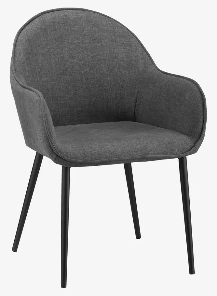 Spisebordsstol med armlæn, der giver ekstra støtte og komfort. Stolen har et polstret sæde og ryglæn i gråt stof. Sorte ben i stål.