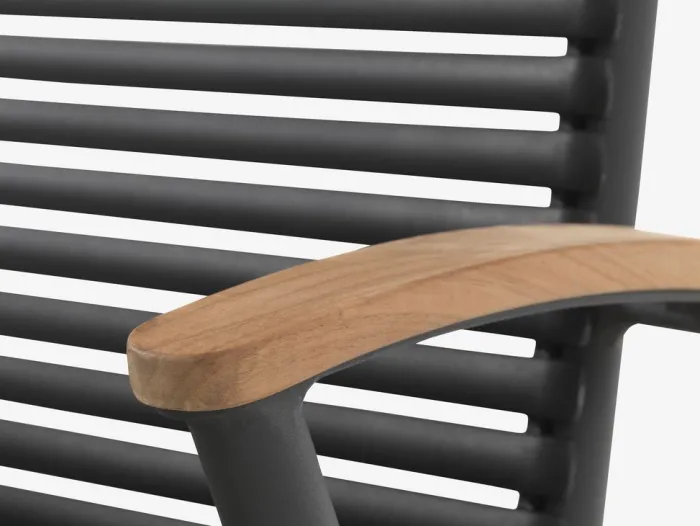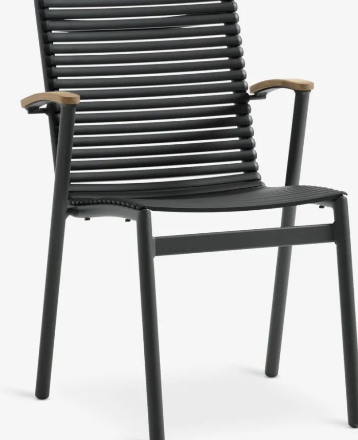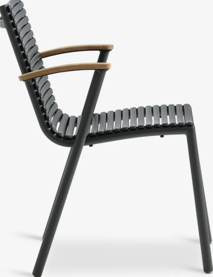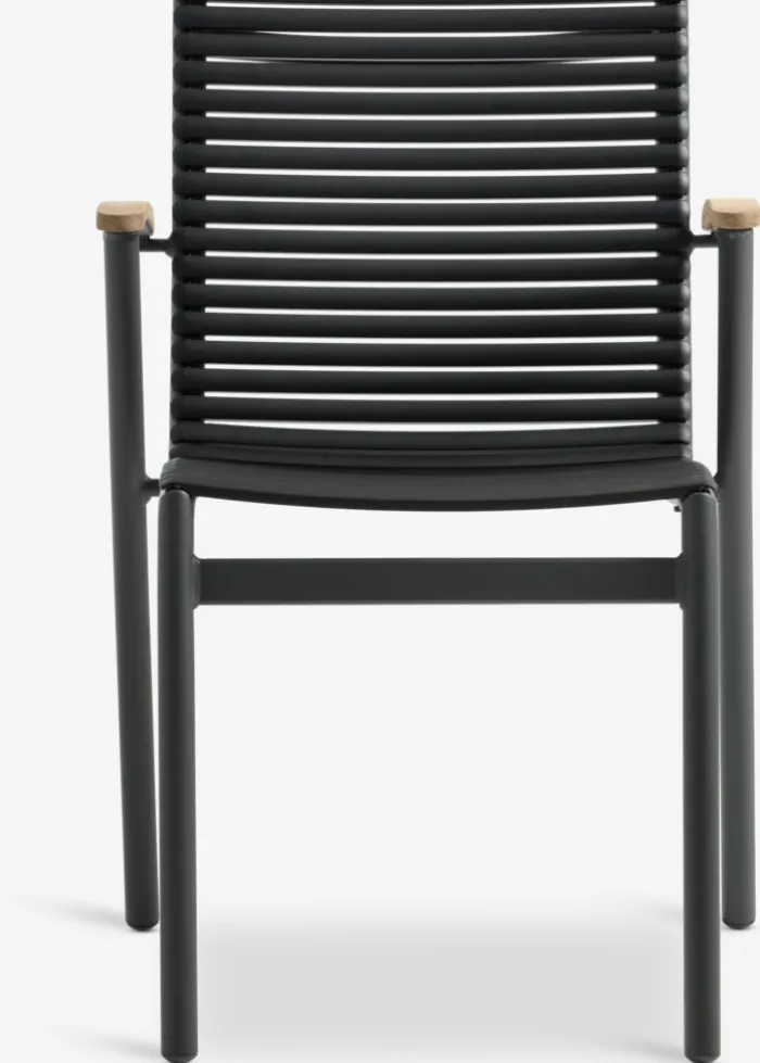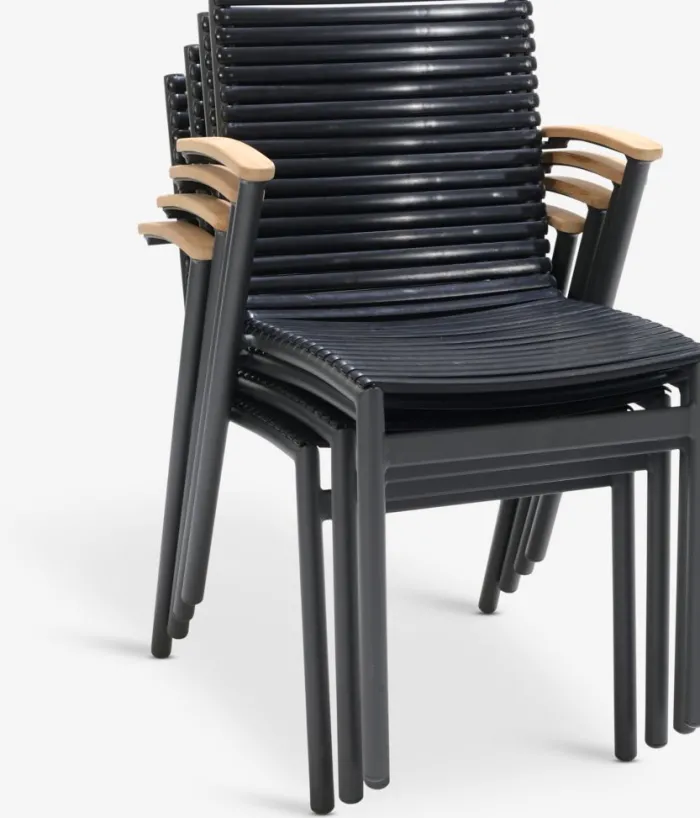 Sort stabelstol med sæde og ryglæn i plast og stel i pulverlakeret aluminium. Armlænene er afsluttet med genanvendt massivt FSC-teak®. Plasten er UV-beskyttet for at forhindre, at farven falmer. Teak er en elegant og holdbar hårdttræstype med et højt indhold af naturlig olie, som forhindrer fugt i at blive absorberet i træet. Med tiden udvikler teak en sølvgrå patina. Aluminium er et let og robust materiale, der ikke ruster. Havestolen kan stables for kompakt opbevaring.