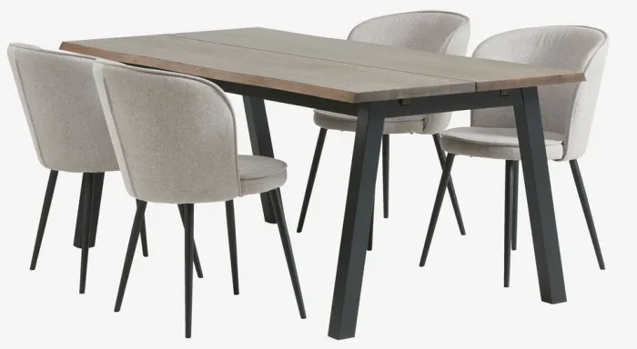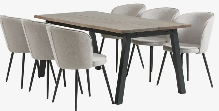 Bord: Massiv eg og egefiner. Ekskl. tillægsplader. B90 x L200 x H76 cm. Stol: Stof og stål.