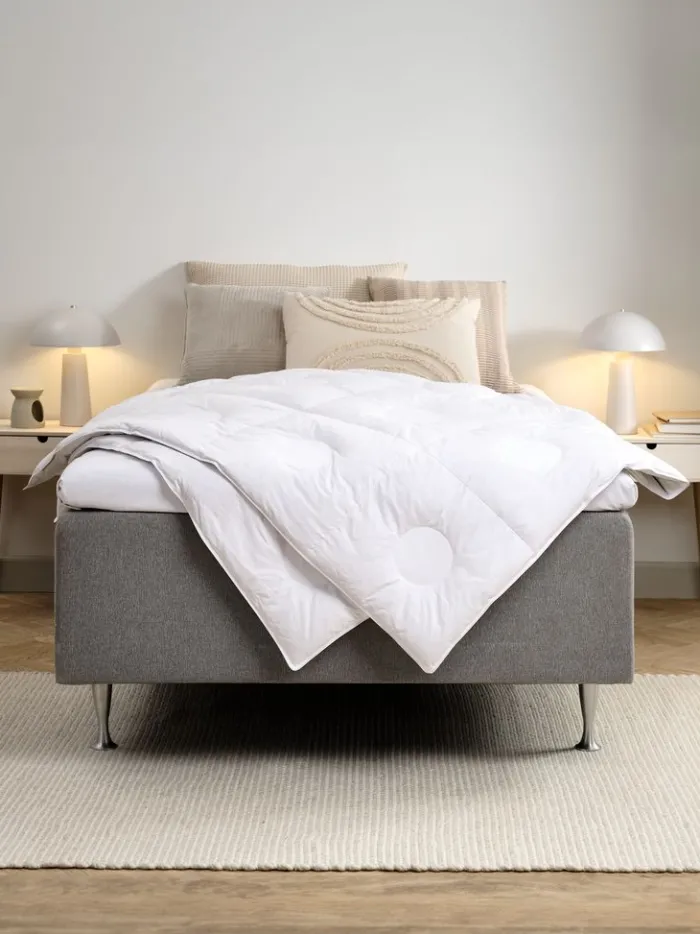 Allergivenlig moskusdundyne 135×200 cm med fyld af 100% hvide, europæiske moskusdun, 240 g. Moskusdun minder om de eksklusive edderdun og har en enestående isoleringsevne. Bolster i 100% jacquardvævet bomuld. Det tætvævede bolster begrænser støvmider i at trænge igennem. Syet i kassetter, så fyldet forbliver jævnt fordelt. Bæreevne 750. Vask 60°C. Inkl. opbevaringstaske.