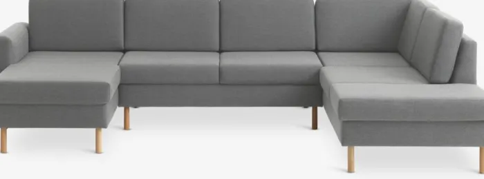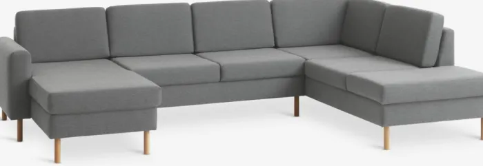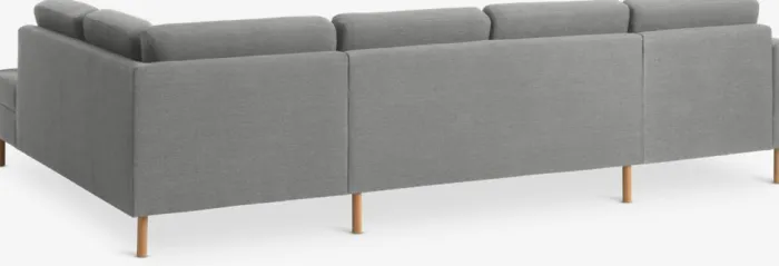 6-personers hjørnesofa i stof. Sæde- og ryghynder i skum. Ben i massiv bøg. Kan ikke spejlvendes. B300 x H81 x D87/155/205 cm