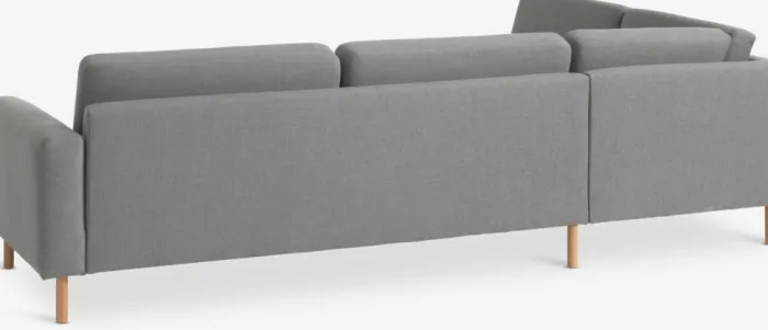 4-personers hjørnesofa i stof. Sæde- og ryghynder i skum. Ben i massiv bøg. Kan ikke spejlvendes. B280 x H81 x D87/226 cm
