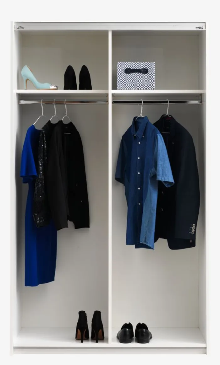 Kunstfiner. Med skydedøre. Skabets indretning: 2 hylder og 2 bøjlestænger. B120 x H201 x D66 cm