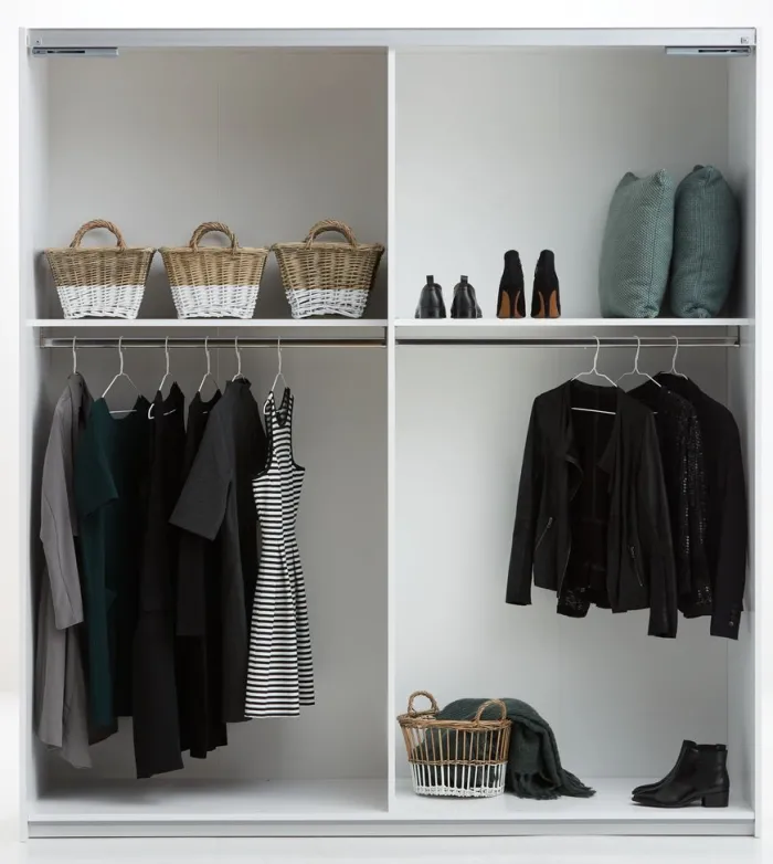 Højglans. Med skydedøre. Skabets indretning: 2 hylder og 2 bøjlestænger. B202 x H221 x D66 cm