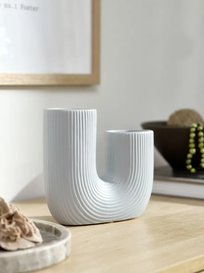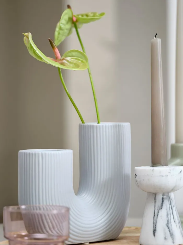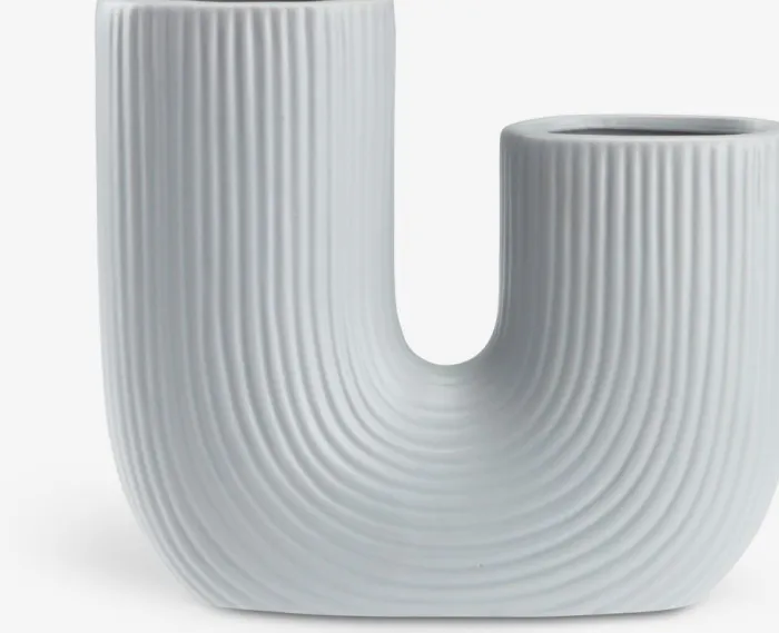Lyseblå vase i stentøj med et unikt buet design og rillede detaljer, der skaber en elegant og moderne stil. Vasen har to asymmetriske åbninger, hvilket gør den ideel til kreative blomsterarrangementer eller som et iøjnefaldende dekorativt element i hjemmet. B18 x L6 x H17 cm