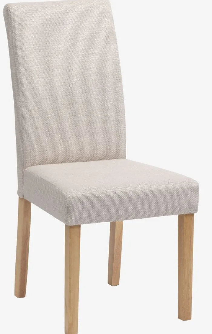 Spisebordsstol med polstret sæde og ryglæn i beige stof. Ben i massivt træ. Træet er lakeret for at forlænge holdbarheden.
