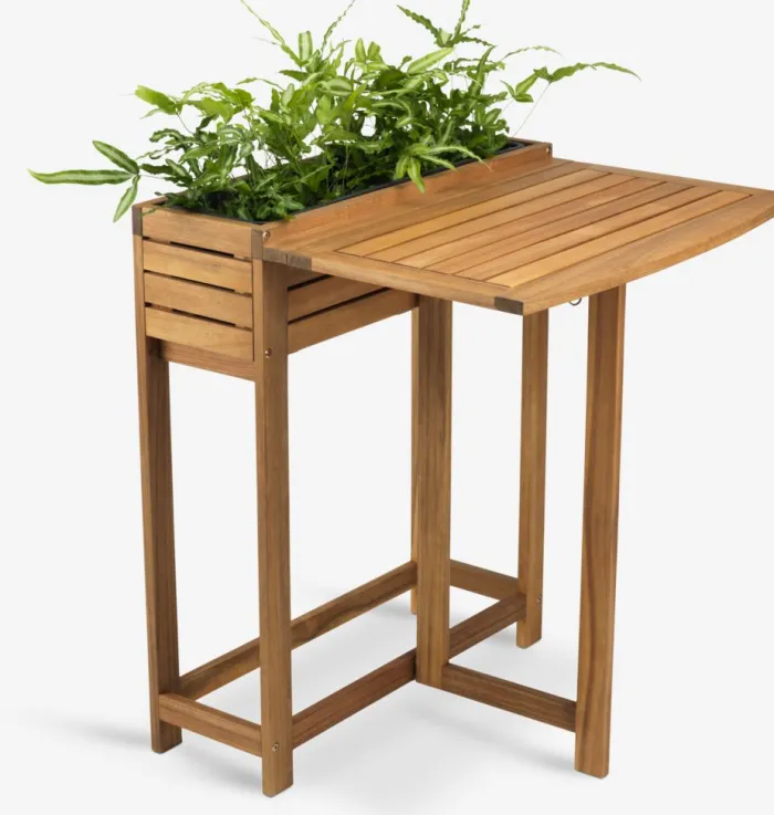 Foldbart bord i olieret FSC® hårdttræ med en indbygget plantekasse til at fremvise dine yndlingsplanter. Dette rektangulære bord er foldbart og ideelt til kompakte altanområder, hvilket giver en praktisk og stilfuld udendørs løsning. B64 x L63 x H77 cm