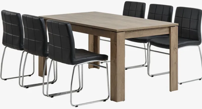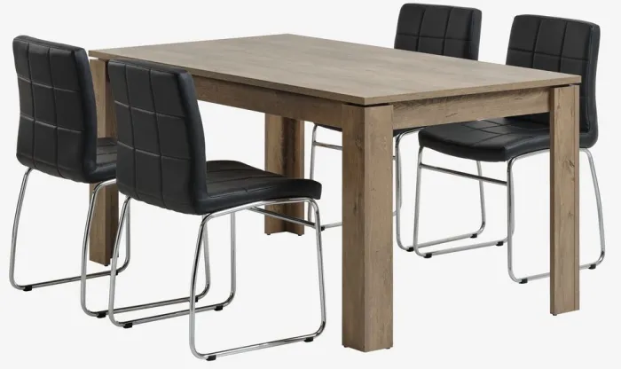 VEDDE + HAMMEL Spisebordssæt|VEDDE L160 bord vild eg + 4 HAMMEL stole sort