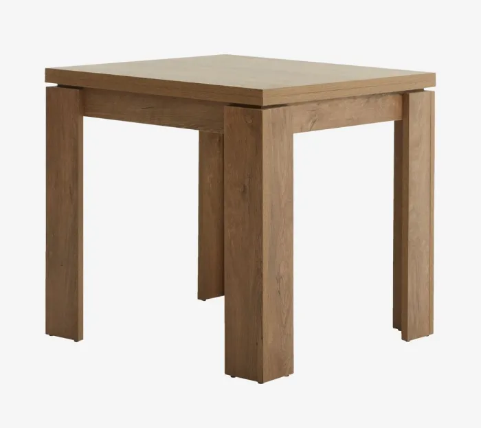 Spisebord i kunstfiner med egetræslook. Flip-toppen giver dig mulighed for nemt at fordoble bordpladens længde til 160 cm. B80 x L80 x H76 cm