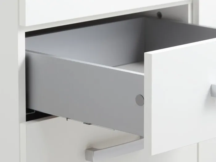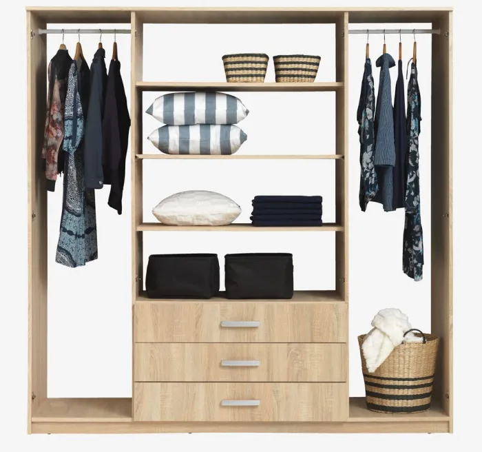 Kunstfiner. Skabets indretning: 4 hylder og 2 bøjlestænger. B200 x H200 x D59 cm