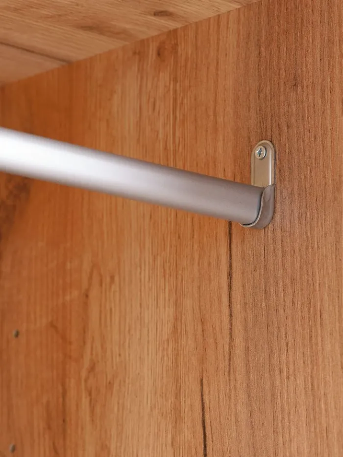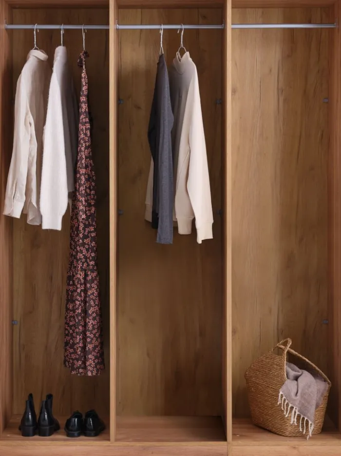 Kunstfiner. Skabets indretning: 3 bøjlestænger. B150 x H200 x D60 cm